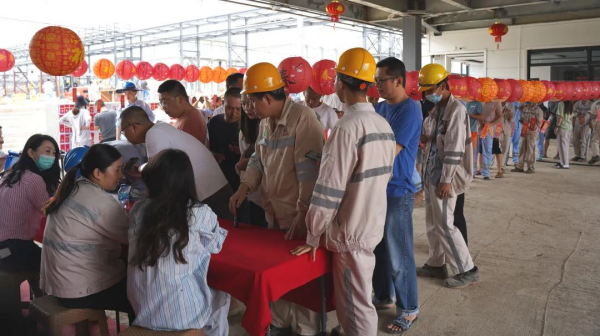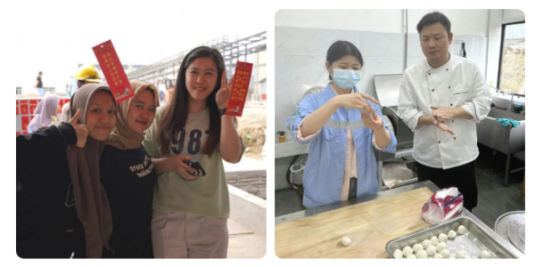 元宵佳節(jié),莫羅瓦利產(chǎn)業(yè)基地食堂門前張燈結(jié)彩,160張燈謎紙條整齊劃一地懸掛在燈籠下面。來自基地各個部門的中印尼員工互相探討燈謎謎底。微風吹來,謎面隨風起舞,兩國員工穿梭其間,流連忘返。猜謎結(jié)束后,大家紛紛入座食堂,共享元宵。