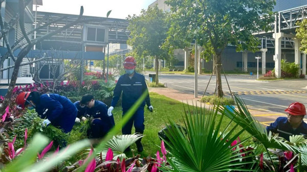 欽州產業(yè)基地200名員工齊聚基地辦公樓旁,大家按部門分成小組,在小組長的帶領下,開展了植樹及為綠植澆水活動,倡議全員爭當綠色低碳踐行者。
