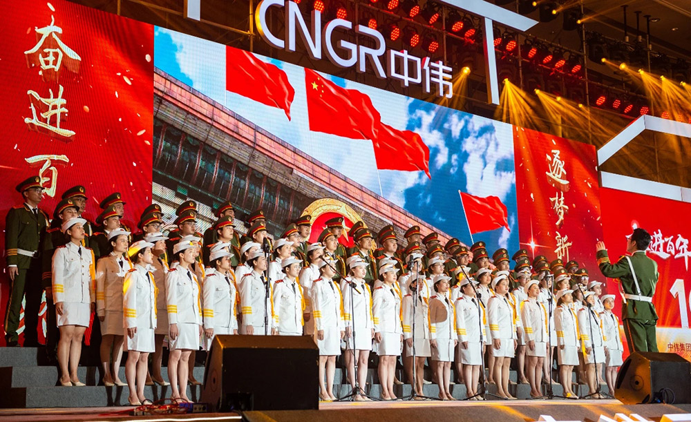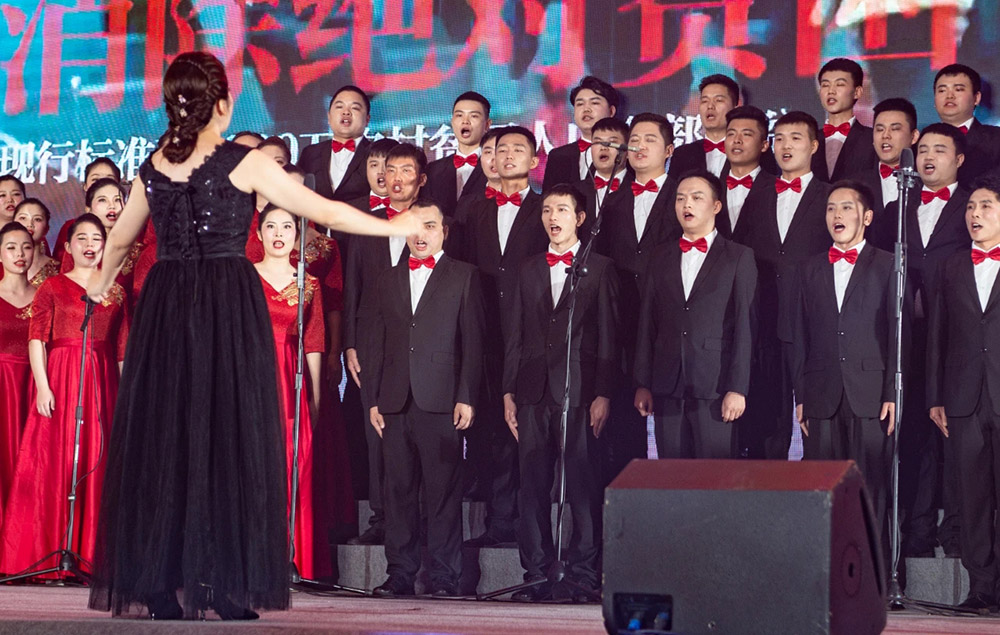 在主持人的宣布下,合唱比賽正式開(kāi)始。來(lái)自各事業(yè)部、各產(chǎn)業(yè)基地的8支隊(duì)伍相繼登臺(tái),他們或穿著光彩照人、顏色各異的演出服,或穿著整齊莊嚴(yán)、意義非凡的紅軍服,伴隨著音樂(lè)老師的指揮,用嘹亮、深情的歌聲,回顧和紀(jì)念中國(guó)共產(chǎn)黨的百年奮斗史。